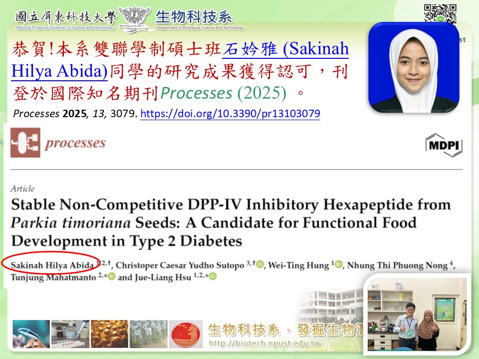 恭賀!本系雙聯學制碩士班石妗雅 (Sakinah Hilya Abida)同學的研究成果獲得認可,刊登於國際知名期刊Processes (2025)