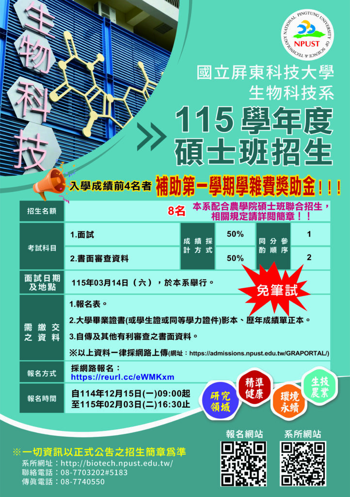 5. 生物科技系115學年度碩士班熱烈招生中~